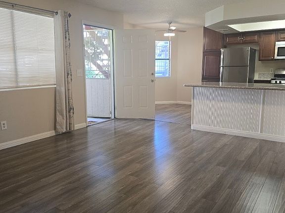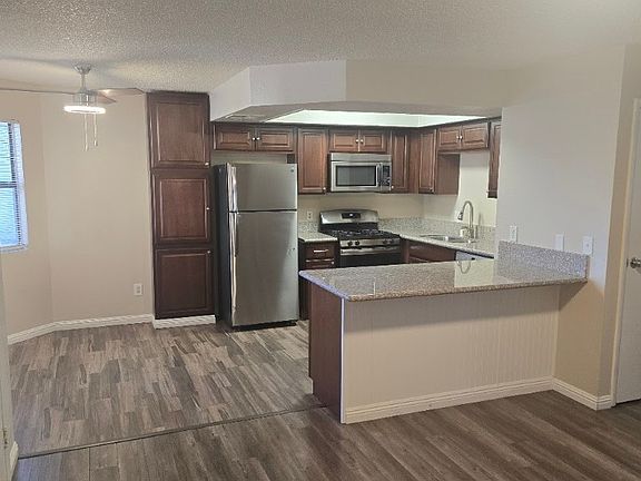 Beautiful downstairs, corner end unit, with patio entrance. 2 large bedrooms, 2 baths. Kitchen has has been remodeled with new cabinets plus added pantry, stainless steel appliances, nook & breakfast bar. GRANITE COUNTERTOPS & breakfast bar seating!! INVESTOR FRIENDLY community! Washer/dryer & refrigerator stay NEW! NEW! Both baths have new vanities, mirrors, lighting, medicine cabinets. Large great room with high ceilings, and a gas FP. Unit is adjacent to the community pool/spa. Near the unit is one covered, assigned parking space plus community has plenty of guest parking. Home is in a quiet location at the back of the community. Great property for first time buyer, downsizing or investment! Rentals are permitted in this community! Nothing for you to do but move in! Some plumbing has been upgraded and replaced. NEW A/C installed June 2025! Great income producing unit! Spotless and ready to go!