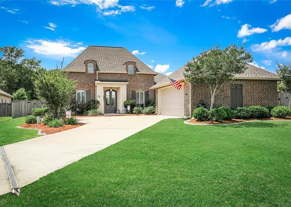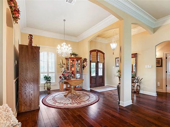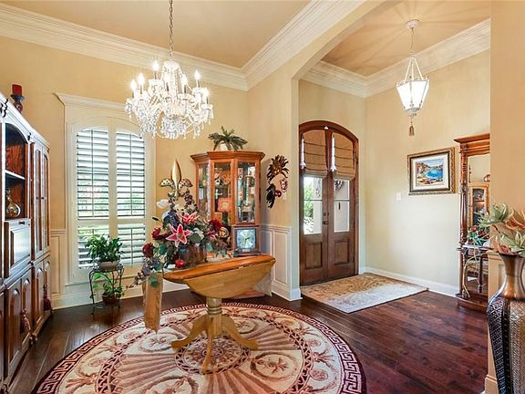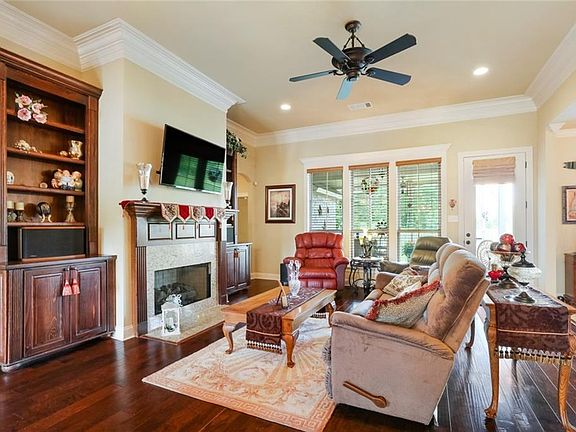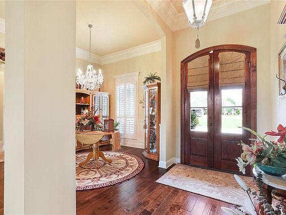 French Country home has an open floor plan, gas fireplace, wide hardwood plank flooring in living area and master. Plantation shutters and custom window treatments on all the windows; granite countertops, french drain and gutters around the whole house. Landscaped gardens welcome you at the front door, while the covered extended patio invites you to relax and enjoy the fabulous view of the community pond and nature walk. Flood Zone C - High and Dry.