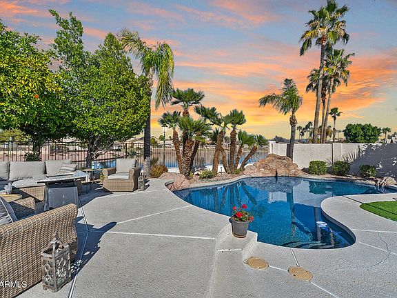 EXCLUSIVE WATERFRONT LIVING! Ever imagined waking up to serene water views right from your backyard? Welcome to your dream home in the sought-after Superstition Springs community. Nestled on a prime waterfront lot, this single level home offers an unparalleled connection to nature. The backyard is a picturesque paradise featuring a stunning Pebble tec pool surrounded by over 2,000 square feet of cool decking. Imagine lounging by the pool, listening to the gentle sounds of the cascading fountain, all while gazing out over the tranquil lake. Step inside to discover a beautifully updated kitchen where chefs will feel inspired. Granite ''leather'' counters provide a touch of elegance and durability, complementing the newer stainless steel appliances. Throughout the home...(click more) plantation shutters add a refined touch while ensuring privacy and control over the natural light. Huge family room with a sliding glass door opening to the spectacular Arizona room with three full walls of windows, offers an immersive indoor-outdoor living experience. It's the perfect spot to unwind and savor the Arizona weather year-round. You'll never want to leave your STUNNING backyard landscaping includes grapefruit & lemon trees, custom low voltage landscape lighting and lush green turf...creating an ideal backdrop for relaxation or entertainment. Additional upgrades include all-new lights and ceiling fans, refreshed bathrooms and a newer washer/dryer.