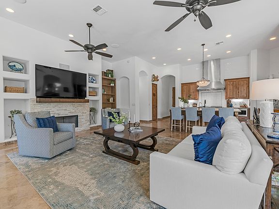 Step outside to your own private oasis. Enjoy Arizona living year-round with a sparkling pool, relaxing spa, tranquil water feature, and built-in BBQ under a pergola with room for a fridge. The covered patio offers plenty of space for outdoor dining or lounging, and the extended grassy area is perfect for pets or play.