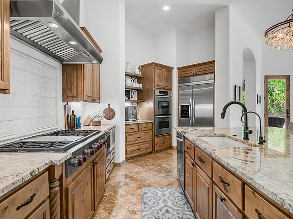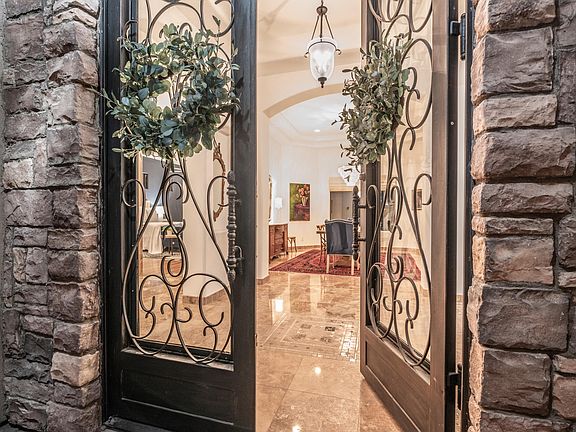 A charming private courtyard leads you to 10-foot custom double iron entry doors, opening to the foyer and elegant formal dining room with coffered ceilings The gourmet kitchen is a chef's dream—featuring a Wolf 6-burner gas cooktop with griddle, double ovens, drawer microwave, coffee bar, and a spacious granite island. It flows seamlessly into the great room with gas fireplace and a separate bar area complete with seating and a built-in wine fridgeperfect for entertaining family and friends.