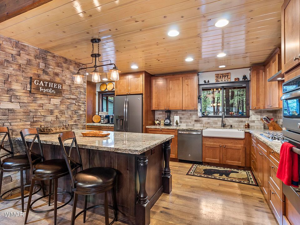 Delightful single-level cabin in Pinetop Country Club, offering 1,919 sq. ft. of beautifully designed living space with vaulted ceilings throughout. Ideally situated directly across from the 17th green and 18th tee box, this 3-bedroom, 2-bathroom home boasts stunning golf course views. The chef's kitchen features chiseled-edge granite countertops, a double oven, and a farmhouse sink, blending style and functionality. Inside, two spacious living areas provide ample room for gatherings, complete with a pool table for added entertainment.