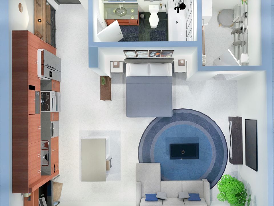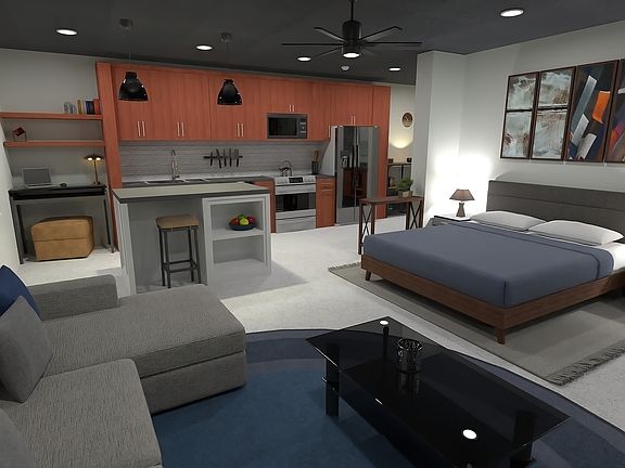 - 575 sq ft open-concept studio with defined living, dining, and sleeping areas.