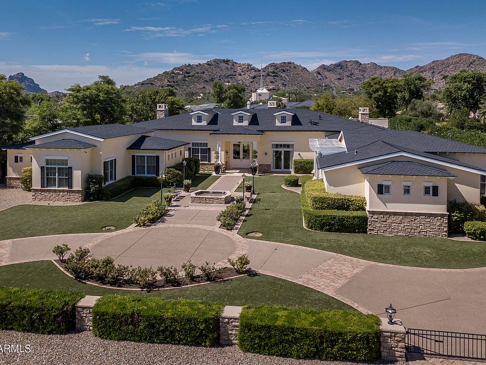 Gorgeous Craftsman style house located in the HEART of Paradise Valley on over acre lot w/ mountain views!. Main House features: 7,198 sq ft with 4 bedrooms+Office+Theater+Craft Rm+Flex Rm+Bonus Rm & 6.5 baths. Guest House features: 942 sq. ft with 1 bdrm,1 bath & full kitchen & laundry. Throughout property: Block Construction, Gorgeous Wainscoting, all Ensuite Baths, Custom Tile, Soaring Ceilings, 4 Gas Fireplaces, Tons of Glass Overlooking Huge Backyard that was made for entertaining. Situated on 1.2 acres w/ Lap Pool, Full Sports Court, Ramada w/ Fireplace, Tons of Grass Area, View Deck w/ Incredible Views of Mummy Mtn & 5 Car Garage! Never been on the market before this property is preppy with coastal sophistication. Located within minutes from all the best shopping & dining!