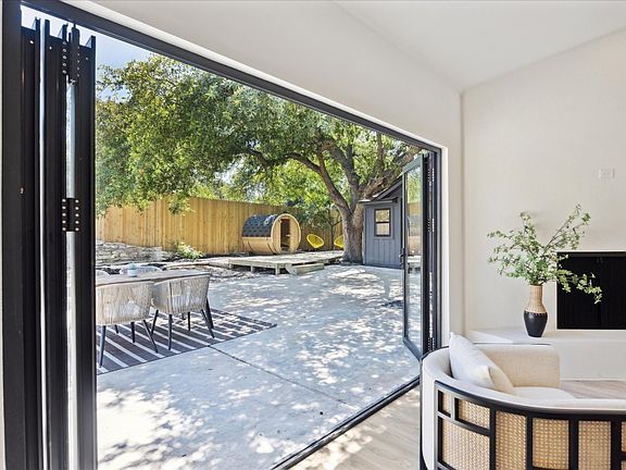Entertain guests or enjoy relaxing afternoons with the large bifold glass doors that lead out to the private, fenced yard and sauna with beautiful oak tree creating natural coolness in the Texas heat. The primary suite has direct yard access for extra indoor-outdoor living. Outside features include front porch, back patio, mature trees, sprinklers, and plenty of space for pets.