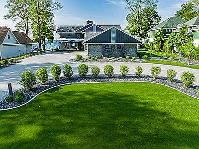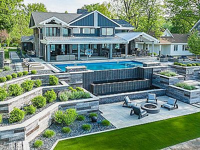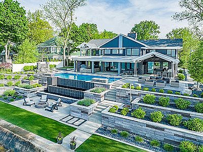 Luxury lake living at its finest! Say hello to this ultra modern, ultra chic home w/ multiple living spaces, infinity pool & 100 feet of frontage on beautiful Lake Wawasee PLUS guest house, barn & outdoor basketball court across street! Located on the north side of all-sports lake, this 2-story, 6 bedroom, 5 full bath, 2 half bath is an entertainer’s dream w/ plenty of room for all your friends & family, either as a full time residence or ultimate getaway. You would never guess the main house was built in 1983 as it has been completely updated & modernized from inside out—including heated driveway, Control4 system throughout, automated shades, Miele & Wolf appliances & phantom screens. Nestled on 0.58 elevated acres offering breathtaking views, outdoor space has been perfected w/ professional landscaping, easy maintenance astro turf yard & tiered rock gardens surrounding the 5 outdoor fire pits, waterfall, in-ground pool (w/ outdoor shower) & covered outdoor kitchen. From the moment you arrive, you’re sure to fall in love w/ the exceptional quality, detail & custom craftsmanship adding unparalleled ambiance w/ modern lighting elements, luxury materials, 3D wall textures & of course, fantastic waterfront views from 3 sets of glass doors that open all the way up lakeside. Open concept main living area is bright & welcoming w/ formal dining beside kitchen featuring large central island w/ seating. Extra long living room can be divided into 2 seating areas w/ wall of stone gas fireplace on one & more casual hangout around full bar w/ wine & beverage fridge on other. Main floor bedroom w/ en suite; lower level has 2 bedrooms, home theater & full bath. 3 more bedrooms upstairs—all w/ en suite baths. Luxurious primary bedroom features wrap-around views, private 2nd floor covered balcony, soaking tub, double sink vanity, walk-in shower & generous walk-in closet w/ built-ins & seating. Relax in comfort by outdoor fireplace w/ TV next to outdoor dining & kitchen—all covered w/ ceiling fans to keep air flowing. 2-story guest house across street on 0.63 acres has 3 bedrooms, 2.5 baths, updated cabinets, paint & flooring. 30x40 barn has heat/air & room for RV, boat storage etc in addition to attached 4 car garage on main house. Basketball court backs up to railroad tracks w/ private, partially fenced yard next to barn. Ideal location on walking trail just down from Wawasee Golf Club w/ easy access to marinas, shopping, dining, groceries, even boat-in waterfront dining!
