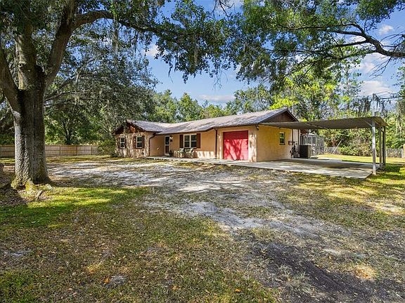 Beautiful Country Retreat with Pool Oasis – Just Minutes from Tampa! Situated on a quiet country road yet offering easy access to all things Tampa, this charming home sits on 1.40 ACRES and features an incredible RESORT STYLE POOL W/ROCK WATERFALL AND GROTTO! Offering just under 1,500 sq. ft. of living space, this 3-bedroom, 2-bath home also includes a 1-car garage, 2-car carport, and large storage shed. As you pass through the gate, you’ll immediately appreciate the privacy and space this property provides. Inside, the open living and dining areas feature wood-look laminate flooring and flow seamlessly into the kitchen—perfect for everyday living or entertaining. The kitchen is well-equipped with a 3-door French refrigerator, 5-burner range with double ovens, dishwasher and built-in microwave. Down the hall, you’ll find three comfortable bedrooms and two full baths. The primary suite, located at the rear of the home for added privacy, features a walk-in closet and updated en suite bathroom with dual vanities, a full-size tub/shower combo, and modern glass and stone tile finishes. Secondary bedrooms are sizeable and each offer closet organizers! Head outside through the dining room sliders and discover your own backyard paradise—a large in-ground pool with a waterfall and grotto that creates the ultimate setting for relaxation or fun. When the weather cools, enjoy evenings around a bonfire in your private yard. There is plenty of space for chicken, goats or horses. The shed houses the submersible well and water treatment system and can accommodate all your yard equipment, too! UPGRADES INCLUDE: Metal Roof (2013), Insulated Windows (2013), Pool Resurfaced (2021), Pool Pump (2024), HVAC and New Ductwork (2013), Well Pump & Casing (2021), Septic Pumped (2025), Interior Paint (2025), New Carpet (2025). Easy access to major highways and enjoy access to many parks, trails for walking, biking and horseback riding. This home truly combines country living with resort-style relaxation—all just a short drive from the city.