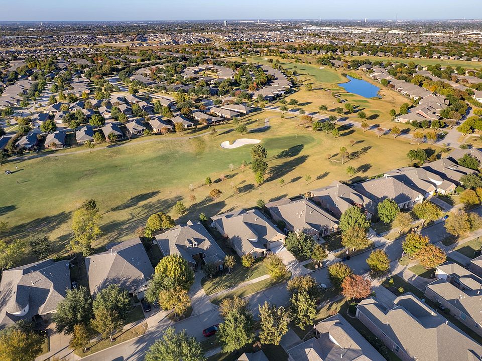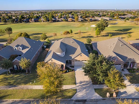 Discover luxurious golf course living in this beautifully appointed single-story home perfectly situated on Hole #1 of the Frisco Lakes Golf Course, offering stunning panoramic views and breathtaking evening sunsets with the cart path positioned on the opposite side for added privacy. The expansive covered outdoor living area is ideal for morning coffee, entertaining, or relaxing al fresco under the Texas sky. Inside, the thoughtfully designed floor plan features 3 bedrooms and 3 full baths located on separate wings, plus a private study with French doors. The spacious family room boasts a cozy gas-log fireplace, custom built-in entertainment center, and tile flooring, seamlessly connecting to the remodeled kitchen and breakfast nook. The gourmet kitchen is a showstopper with a counter-height quartz island, abundant cabinetry, built-in refrigerator, gas cooktop, double ovens, convection microwave, separate coffee bar, bar seating, and a walk-in pantry. The serene primary suite offers a generous seating area, dual closets, and a spa-like bath with dual vanities, jetted tub, and a walk-in shower. Plantation shutters adorn most windows, and the 3-car garage provides ample space for vehicles, golf cart and storage. New Water Heater 11-25, Roof Replaced 2017. Located in the vibrant 55+ community of Frisco Lakes, residents enjoy resort-style amenities including golf, tennis, pickleball, bocce ball, indoor and outdoor pools, fitness centers, walking tracks, gardening, billiards, libraries, and a full-service restaurant and bar at the golf club—making this home the perfect blend of elegance, comfort, and active living.