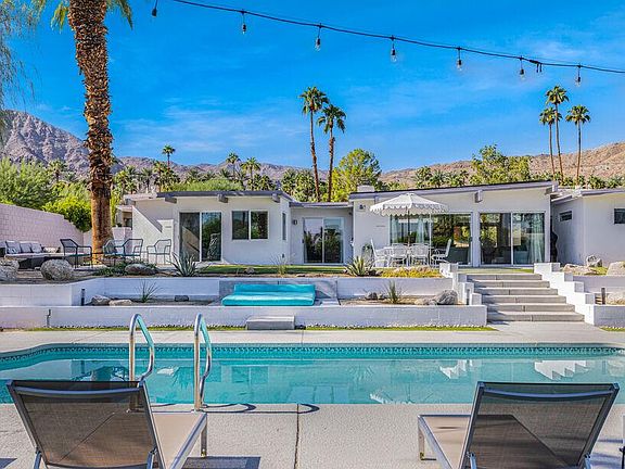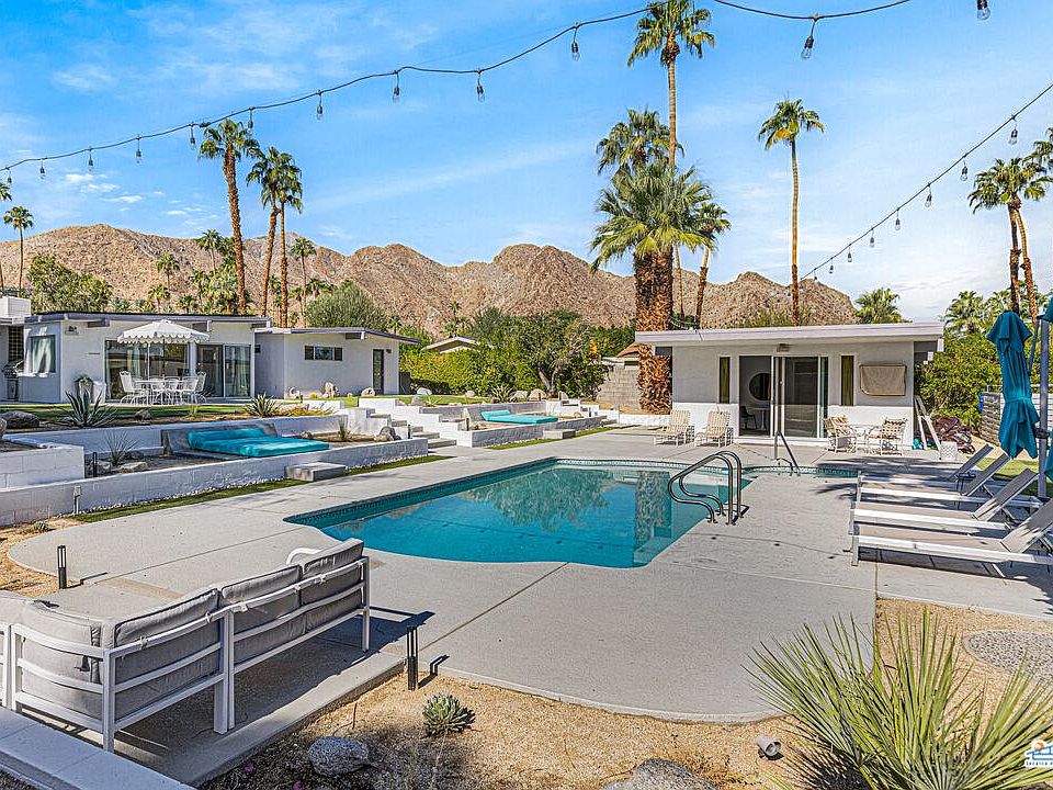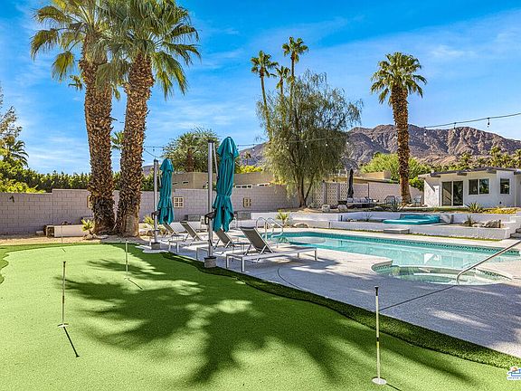 Updated throughout! Spectacular, private oasis, nestled against the mountains in Magnesia Falls Cove. Main house has 2 en-suite bedrooms, 2 additional bedrooms with full bathroom across the hall. Master retreat has fireplace and access to outdoor living areas. 2nd master also has access to backyard. Living area has fireplace, bar with wine refrigerator, dining area and walls of glass to provide an abundance of natural light. Family room is adjacent to primary bedroom, with access to backyard pool/spa. Casita has bedroom, bath and living area with microwave and refrigerator. Enjoy multiple areas for lounging in the oversized backyard: 2 sectional sofas, lounge chairs, 2 foam pads/beds next to pool and 2 dining tables with chairs that can easily seat 10 people! 4 large umbrellas for sun protection around pool area and sectionals, and additional umbrella over dining table next to house. Adjacent to pebble tech pool/spa is a putting green to practice golf! Location is just steps away from The River in Rancho Mirage for shopping, restaurants, movies or coffee shops, 10-15 minutes to El Paseo in Palm Desert or 15 minutes to Palm Springs. This retreat is perfect for an extended family vacation and casita provides privacy for guests or work space! Furnishings are newer, with high speed internet, Sonos, smart TVs (including one outside by the pool area). Minimum 28 day rental. Currently rented December 2022 and March 2023.