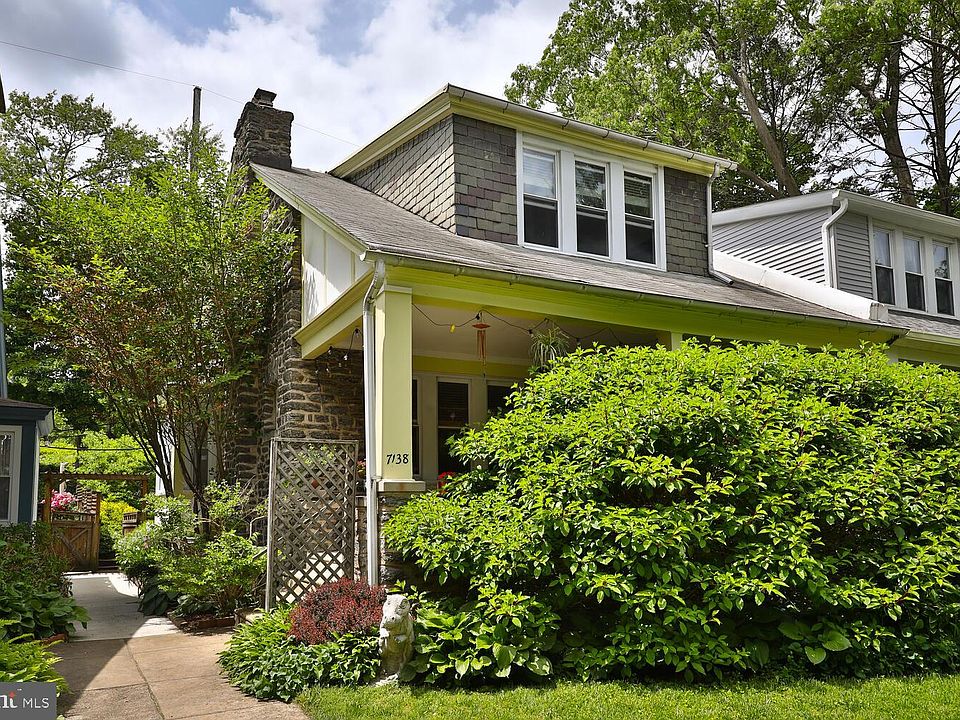 Steps from the Cresheim Trail, Allens Lane Train Station, and High Point Cafe find this absolutely charming and spacious porch-front twin on a beautiful tree lined block in West Mount Airy. From the street, stroll past the mature garden including a dazzling, almost ready to bloom hydrangea and onto the serene front porch, big enough for small gatherings or just solo relaxation time while you listen to the breeze and birdsong in the trees. Once inside you'll be pleasantly surprised by the spaciousness of this two story home with a comfortable living room, dining room and modern open kitchen with barstool seating. Beyond the kitchen is a convenient mudroom to store all of your equipment and garden tools, and beyond a fantastic patio and huge backyard for playing, gardening, outdoor dinners, entertaining, or just sitting back. Upstairs on the second floor offers three spacious and sunny bedrooms and modern hall bath. The lower level is mostly finished with a family room, office nook, bedroom, full bath, and laundry room with work space. This space easily and comfortably accommodates guests or an au-pair. The main levels have original hardwood flooring throughout and almost all windows have been updated other than the original ornamental ones in the living room. Spacious two story homes with larges yards like these do not often come on the market, and sell quickly. Do not miss this one!