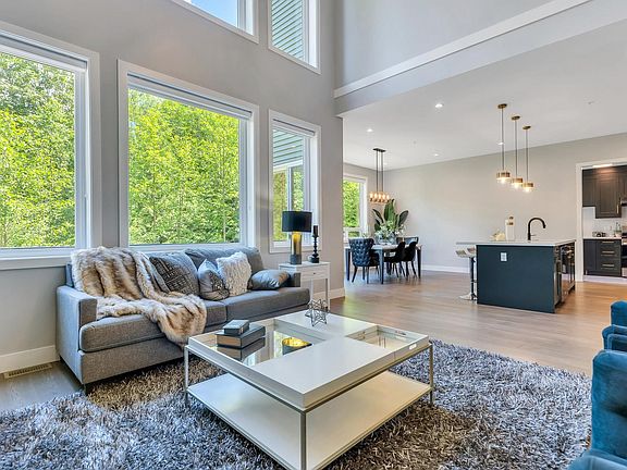 Vaulted ceilingHuge windowsNatural lightForest viewsGourmet kitchenQuartz countertopsShaker cabinets