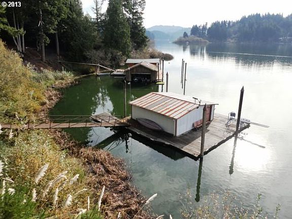 Amazing lodge style home directly on the lake. Beautifully remodeled living room with blue-pine and panoramic lake views. Myrtlewood bar, sauna, and spa by master bdrm, plus full size boathouse with diving board. New heat pump and stainless refrigerator. Perfect as a full time home or vacation destination. County says 3 bedrooms, but bonus rooms add up to 6 possibile bedrooms. Road access and boat access. Most furniture included.