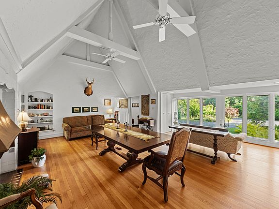 - Description: Cathedral beamed ceiling, gas fireplace, wood floors