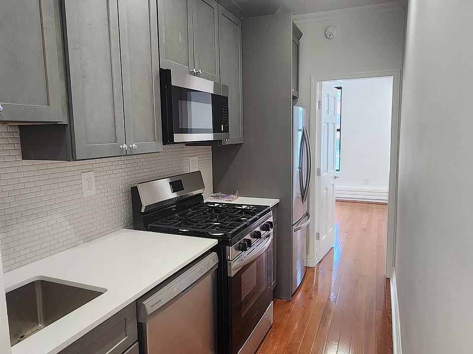Large one bedroom apartment, completely renovated. Apartment features high ceilings, great layout with spacious living and dining room combination West facing. Custom large galley kitchen with stainless steel appliances, dishwasher and stone counters.