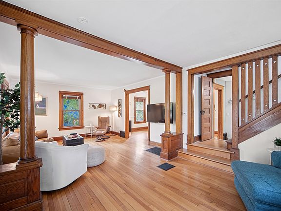 Formal dining roomOriginal woodworkStained glass windowsSecond floor laundryMature treesHardwood floorsNatural light