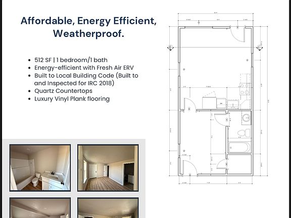 Brand New Energy Efficient Home - Discover modern tiny living with big comfort in this 512 sq. ft. 1-bedroom, 1-bathroom home. Thoughtfully designed with energy-efficient features and a Fresh Air ERV system, this home offers a clean, comfortable, and sustainable living experience. Enjoy quartz countertops, luxury vinyl plank flooring, and an open-concept layout that maximizes every inch of space.