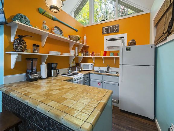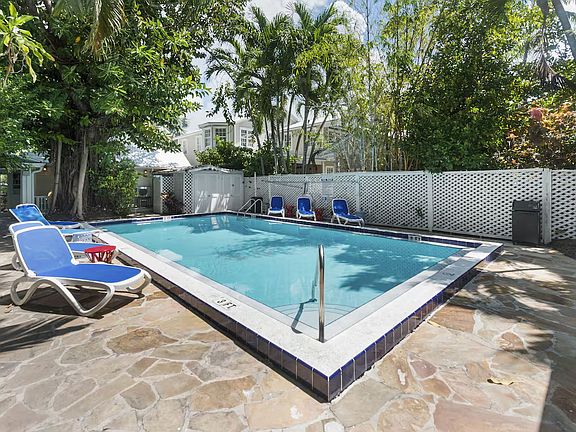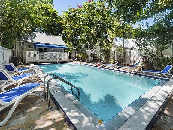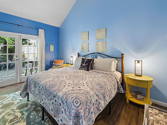 Located in The Colony, a secluded, gated enclave just steps from Duval Street, Colony Sunset is a colorful and relaxing retreat. Walk up the flagstone path and enter the home through the vivid and cheerful living space, accented with cerulean blue walls and splashes of tropical art. A vaulted ceiling with exposed beams and huge transom windows that extend all the way to the tip of the roof add a bright and airy feeling to the cozy space. Just through the French doors lies a private deck for sunning, relaxing and al fresco dining. The fully appointed kitchen is attached to the living area and features a sit-down bar, charming open shelving and a bright color scheme. The bedroom is painted in soothing blue tones and features cathedral ceilings, a king size bed, and flat screen television.