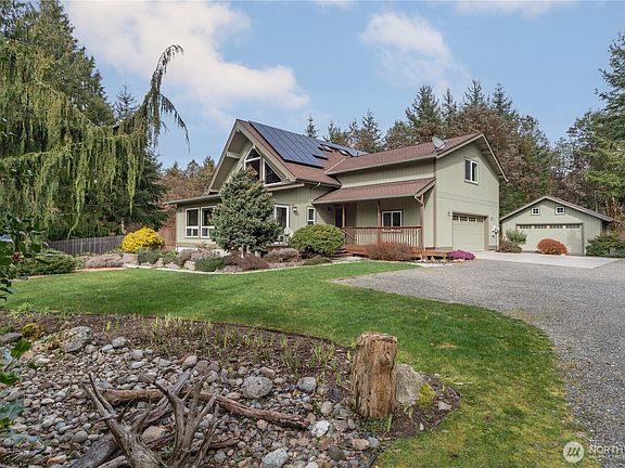 This amazing home & grounds provides year-round comfort & beauty. Vaulted ceilings & large windows bring light into the dining/living areas. Kitchen has Corian & granite counters, loads of storage, extra sink and an island. Main: 2BRs, full bath, utility room w/a safe. Upstairs is a very large Primary bedroom w/balcony, walk-in closet & bath w/step-in shower. Big studio room too! Large garage w/the solar panel box & hybrid water heater. Separate double garage. Fenced back yard & trails through the woods leads to Old Fort Townsend. Gardener's delight has a sunny fenced garden in front w/asparagus, berries & dahlias. Many other gorgeous plants- rhododendrons & specialty trees. Solar panels on roof. Offer Review Sat. 3/22, 9:00 am. See today!