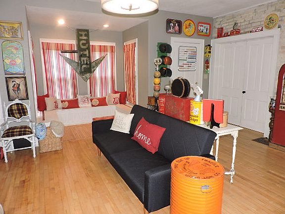 Fantastic opportunity to own this unique historic all brick home with river views! Open concept living space, natural lighting, beautiful hardwood floors throughout, exposed barn beams, handcrafted kitchen island, granite kitchen & upper bath counters, walk-in pantry. Tastefully exposed and hidden cubby areas, whirlpool tub, lower level family room with gas fireplace, stained & polished cement floor, hidden doors to bathroom, laundry areas. Lower level game room has an egress window and a slide leading from a trap door in the living room! Master bedroom & first floor bedroom have walk-in closets. Fenced yard, patio, front porch, fire pit, yard loveseat, new roof (shingles) in 2018, basement drain tiled. Some photos different that when viewing due to sellers packing up items for moving.