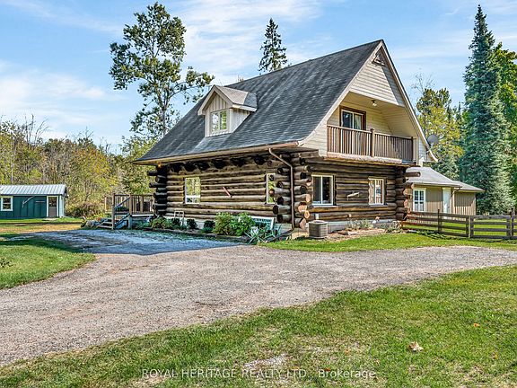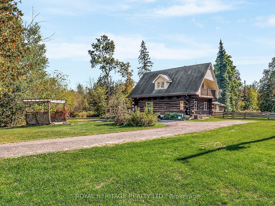 Absolutely stunning 4+2 bath log home set on 4.5 acres of private paradise. This one-of-a-kind property offers the perfect balance of rustic charm and modern comfort. Inviting heated entry led to an open concept living area with warm exceptional log craftsmanship of exposed wood beams and timeless pine hardwood. The main floor features a bright and cozy kitchen, dining area, and large living room. A beautiful main-floor bedroom, second full bathroom, and living room with a wood burning stove inserted in a stone surround. Sunken laundry room completes the level, along with direct access to a fully fenced yard ideal for pets or horses to run free. There is a brand new firepit for those warm star gazing nights. Three generously sized bedrooms and a full bathroom awaits upstairs. Two of the bedrooms include private balconies, creating the perfect spot to enjoy peaceful mornings or evening sunsets. Outside is a dream: gravel circular driveway, workshop with hydro, large two-Storey pole barn with loft & hydro, woodshed, generator shed hook-up close to the main house. Offered fully turnkey, this home comes complete with indoor and outdoor furnishing, smart lock access and strong Wi-Fi, you'll enjoy both convenience and comfort in your private paradise.
