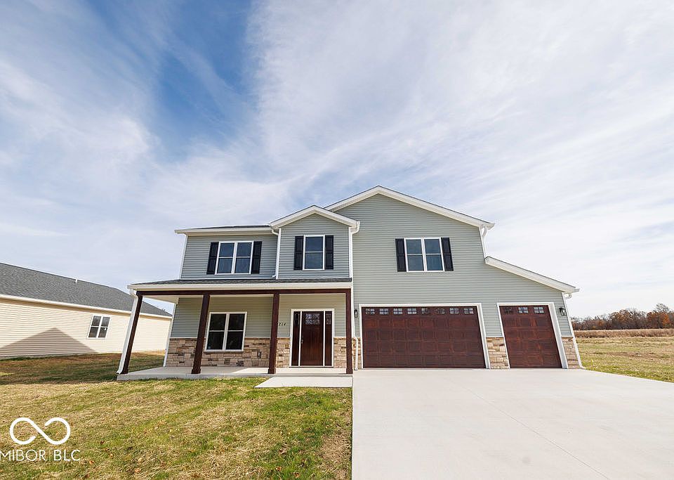 There's something special about coming home to 714 White Oak Road. With its welcoming front porch, open spaces, and modern finishes, this two-story Juniper floor plan offers 2,252 square feet of comfortable living. Step inside to a bright living room that opens to the kitchen-the true centerpiece of this home. You'll love the large island, quartz countertops, solid wood cabinetry, and tiled backsplash, all designed to bring style and function together. Just beyond the kitchen is the dining area, a cozy spot for weeknight dinners or weekend gatherings. A mudroom and half bath lead out to the three-car garage, keeping daily routines simple and organized. Upstairs, there's space for everyone. A large family room sits at the center of the second floor-perfect for movie nights or a game area-while the convenient laundry room keeps chores close at hand. The primary suite features a dual-sink vanity, walk-in tiled shower, and spacious walk-in closet. Two additional bedrooms and a full bath complete the upstairs layout. Located in the sought-after Four Oaks Subdivision, you'll enjoy community amenities like a walking trail around the private lake, dog park, and clubhouse-all just minutes from Ellettsville, Bloomington, and downtown Spencer.