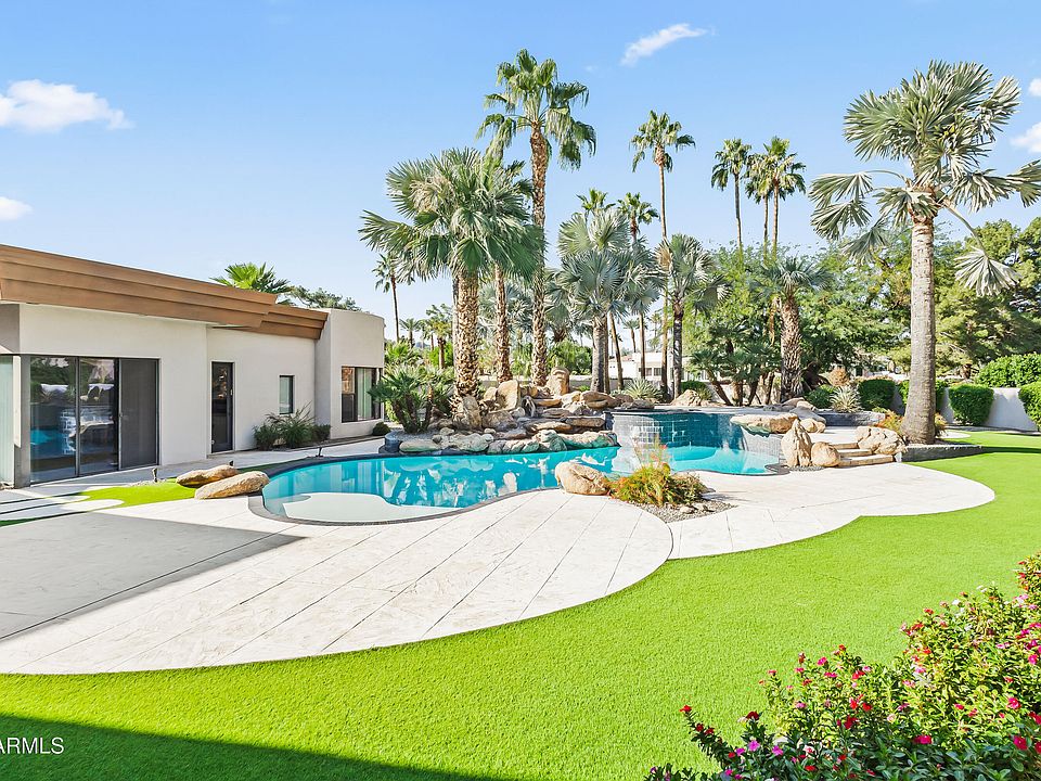 A rare opportunity to own nearly one acre within the prestigious, gated Cheney Estates of Paradise Valley. Perfectly positioned on a premium corner lot, this property offers exceptional privacy and limitless potential to reimagine and elevate the existing residence into a truly personalized luxury estate. The grounds include a main residence plus a detached guest house, providing incredible flexibility for hosting, multi-generational living, or a private work retreat. Inside, high ceilings and an open-concept great room is anchored by a wet bar and gas fireplace, flowing seamlessly into a spacious kitchen featuring a pantry, gas range, and dual islands with an inviting eat-in dining area. A separate formal dining room provides an additional venue for entertaining. With five ensuite bedrooms, an office, theater, and gym, the floor plan offers exceptional adaptability. The expansive backyard is an oasis, showcasing a custom pool and spa, generous lawn space, and mature palms and desert landscaping that frame the serene outdoor setting. Just minutes from Paradise Valley's world-class resorts, spas, golf, shopping, and dining, this property presents an unparalleled opportunity to customize and elevate a luxury home in one of Arizona's most sought-after communities.