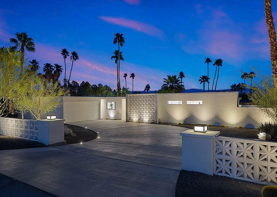 The Magnesia Falls Cove neighborhood of Rancho Mirage is a treasure trove for Mid-Century Modern enthusiasts, with gems still being discovered and brought to their past glory. In 2021, a renowned historical preservationist and developer from San Francisco bought 74128 Biskra Road with the goal to re-imagine the ultimate mid-century desert lifestyle. This home has been completely upgraded, from plumbing to electrical, new LED lighting, high efficiency mechanicals, new landscaping, hardscaping, fixtures, flooring, cabinets, glazing and appliances. The silhouette is unmistakably 1961. Flat roof, broad eaves, a sculptural plane of breeze block that stands before the entry like a semaphore declaring its history. Blending with those historical traits are modern elements of luxury: a broad pivot door entry, warm hardwood floors in the bedrooms, Italian cabinetry throughout. The views from the home are extraordinary: northward are jetliner views to the Chocolate Mountains; to the south, the Santa Rosa foothills tower over the home. 74128 Biskra Road sits upon one of the highest streets in the Cove. At the very top, is the newly opened ultra luxury Sensei Resort, owned by Larry Ellison. There is no HOA, and Rancho Mirage's best shopping and dining is steps away at the foot of the hill.