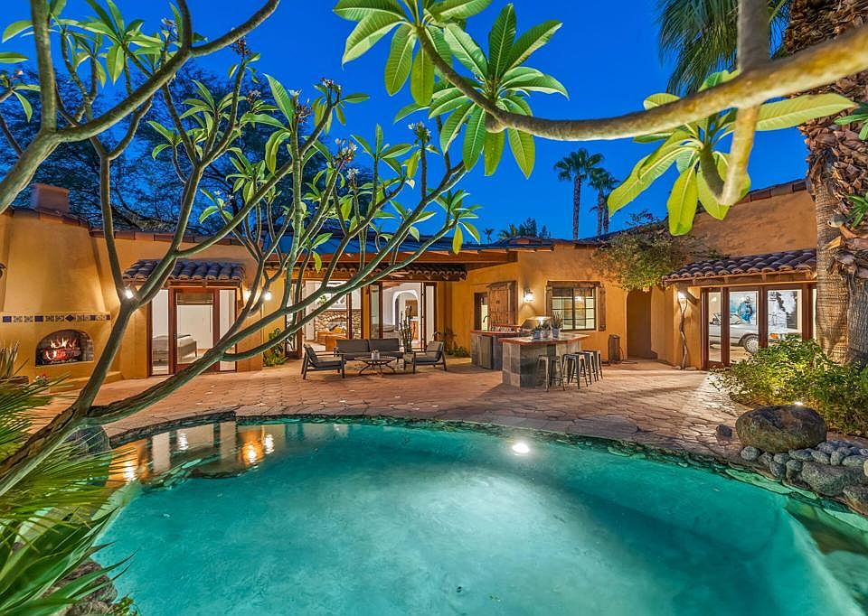 PRICE REDUCED TO SELL !! Presenting a 2005 version of a modern Mexican hacienda in the heart of Magnesia Falls Cove! Gated and totally private, this VERY unique home enjoys pueblo and Spanish Colonial influences surrounded by a virtual botanical garden featuring citrus, fig and palm trees, plumeria, and dramatic varieties of yucca and cactus. 4 beds and 5 baths with room for more if needed! Separate enchanting casita PLUS a 6 CAR GARAGE, PLUS bonus room, gym or office, large laundry and bath. The custom and unique pool & spa will convince you that you're on an exotic vacation. MANY recent upgrades and improvements (see attached document) complement the rustic warmth and old-world charm of natural wood, terra cotta and Talavera tiles, vigas, arched doorways and wooden beams. Fountains, water features, a poolside fireplace and outdoor shower just to make sure you relax, indulge and extend your stay! THIS is a most unusual and luxurious desert retreat.