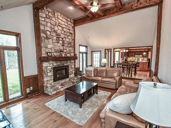 Welcome home to Modern Rustic Elegance. Gorgeous woodwork and flooring are the hallmark of this beautiful home. The spacious gourmet kitchen with stainless island is a dream to prepare meals. Handsome hardwoods throughout the space lend a cohesive warmth to the entire home. Relax or entertain in the soaring family room with stone fireplace, beamed ceilings and accents. All furniture will compliment the freshly painted neutral colors. The full basement offers tons of storage with new shelving that stays with the home. Outside you will enjoy a stunning new garage door 2015, fresh landscaping designed and installed in 2015, a long, full concrete driveway with round about 2015. You'll really appreciate the over-sized garage. Entertain on the magnificent patio in the wooded and private backyard. You won't have to worry for years with a newer roof, furnace and AC. Conveniently located with easy access to the Community Rec Center, shopping and highways. All of this is situated on a generous 1.4 acre lot. Low utilities are a plus in this home. with average monthly costs as follows: Gas, $75, Electric $100, Water $30. Don't miss this marvelous home. Call today for a showing.