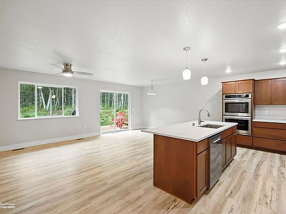 Open conceptWalk in closetCeiling fanStainless steel appliancesLatte stained walnut cabinetsQuartz countertops