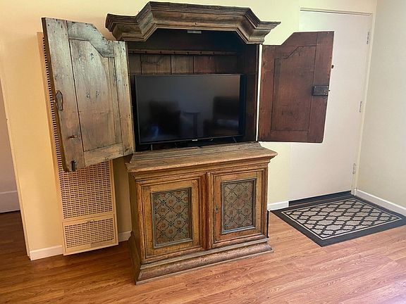 The furnishings are warm and inviting with laminate flooring throughout. The living area includes a sofa, recliner, desk, a large, smart TV, and a dinette. The comfortable bedroom offers a queen bed and a second desk.