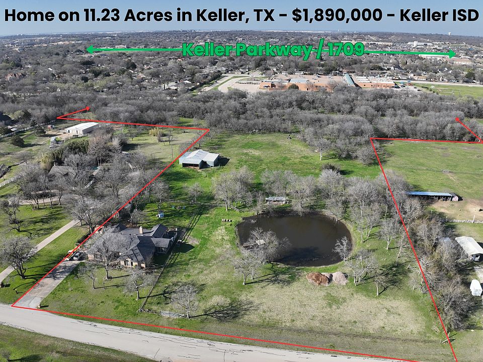 ONE-OF-A-KIND - An exceptional 4-bed, 3-FULL bathrooms home on 11.23 ACRES in the heart of Keller, TX. This 2,101 sq ft residence has been thoughtfully UPDATED with VAULTED ceilings, SKYLIGHTS, SLATE flooring and fresh paint, plus a HIDDEN 200 sq ft bonus room perfect for a PRIVATE OFFICE or STUDIO SPACE. The bright, OPEN layout creates a warm, inviting atmosphere, while a private SCREENED-IN retreat off the primary bedroom offers the perfect place to enjoy morning COFFEE or UNWIND at the end of the day. The LARGE fourth bedroom can double as a SECOND living area, GAME ROOM, or secondary PRIMARY suite, adding FLEXIBILITY to the floor plan. Step outside to a SPACIOUS rear deck overlooking the property, providing a peaceful, COUNTRY SETTING for outdoor living and entertaining. The land is divided into three separate lots, with 9.23 acres currently benefiting from an AGRICULTURAL TAX EXEMPTION (buyer must maintain exemption). CROSS-FENCING makes this property ideal for HORSES, chickens, ROOSTERS, cattle, BEES, goats and other livestock (NO swine), while a STOCKED POND adds scenic beauty and recreation. The property features approximately 1,250 feet of BEAR CREEK frontage along the rear boundary, bordering the Bear Creek GREENBELT and TRAIL system, with trail access just a short walk down the street. A large AIR-CONDITIONED shop-barn includes its own 200amp electrical service, WATER, exterior Stalls, enclosed RV parking, and abundant storage or WORKSPACE. Perfectly located just off Keller Parkway-1709 & Rufe Snow Dr, this UNIQUE estate offers the best of COUNTRY LIVING and CITY CONVENIENCE, minutes from shopping, DINING, Keller Pointe RECREATION Center, Town Center Nature PARK & TRAILS, and local EQUESTRIAN facilities. Within the prestigious KELLER ISD zoned to WILLIS LANE Elementary, INDIAN SPRINGS Middle and the highly sought after KELLER HIGH. Whether you’re seeking a PRIVATE RETREAT, a WORKING FARM, or an EQUESTRIAN HAVEN, this property offers endless potential.