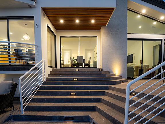 The heart of the home is a European-designed Snaidero kitchen featuring professional-grade stainless steel appliances, stylish finishes, and thoughtful touches throughout. Entertain effortlessly with a wet bar, media room, motorized window shades, and walls of glass that open fully to the expansive bayside patio.