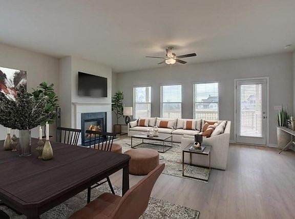 - Open floor plan with large family room, fireplace, and hardwood floors.