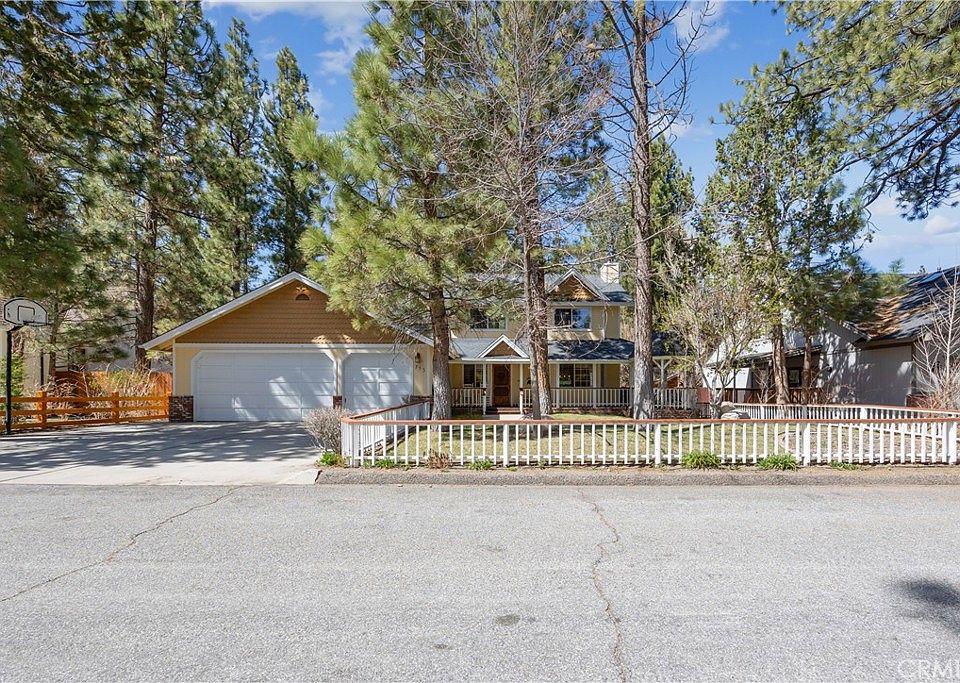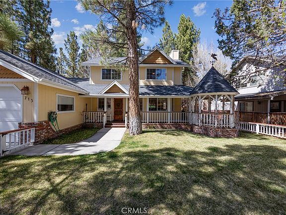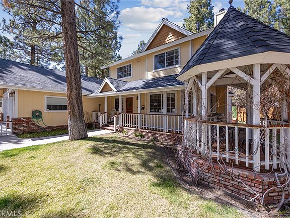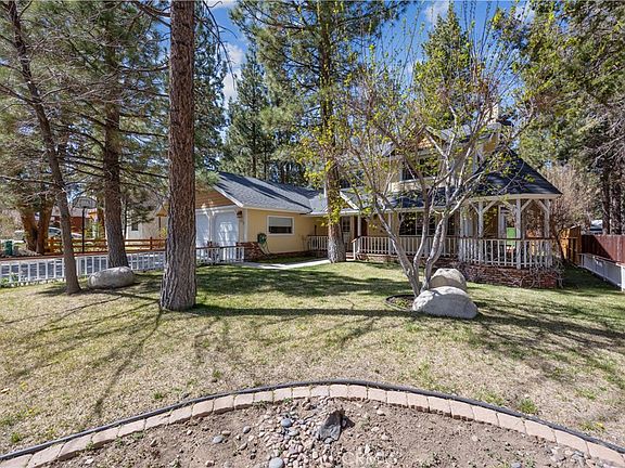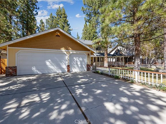 Welcome to your dream mountain retreat in the heart of Big Bear City's highly sought after Forest Springs neighborhood with underground utilities. Nestled on a quiet cul de sac surrounded by towering pines, this beautifully maintained, custom built home offers the perfect blend of style, comfort, and functionality. This property is ideal as a full time residence, weekend escape, or income-generating property. With 4 spacious bedrooms, including a main floor bedroom, 3 full bathrooms, including a primary suite with a spa-like jacuzzi tub, and a versatile bonus room perfect for a home office, den, or game room, this spacious home is designed for both relaxation and entertainment. Pride of ownership shines through with thoughtful upgrades like newer wood floors, decorative beams, recessed lighting, and updated fixtures throughout. At the heart of the home is the spacious kitchen boasting granite countertops, oak cabinetry, a central island, coffee bar, and high end Whirlpool and Bosch appliances, plus a walk in pantry to keep everything organized. The light filled great room is anchored by a cozy wood burning fireplace and 180 degree bay windows that frame the breathtaking beauty of Big Bear’s true four seasons. Step outside into your own private oasis that features a beautifully landscaped, fully fenced yard bursting with low maintenance perennials, lush greenery, and an automated, in ground sprinkler system. Enjoy al fresco dining on the large rear deck, cozy up with a book on the wrap around covered front porch, or unwind in the ivy laced gazebo with a glass of wine or cocoa under the stars. In the backyard, there is 220v electrical in place for a future spa. The backyard also features a large shed that matches the exterior paint and theme of the main home. Additional amenities include a 3 car attached garage with a "Fun Zone" that features ping pong, foosball, and air hockey, a laundry/mudroom with direct access to the main home, garage and backyard, ample attic storage, and a large concrete driveway with room for all your vehicles and toys. This property is South facing, resulting in lower maintenance costs during the winter months, and is situated on a large, flat lot.