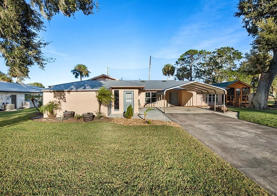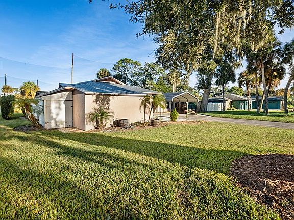 GREAT LOCATION!!! This well-maintained 4 BEDROOM, 2 BATHROOM GOLF COURSE home with NO HOA has an additional large RV/BOAT CONCRETE PAD adjoining the backyard to the NEW SYMRNA BEACH MUNICIPAL GOLF COURSE. NO BACK NEIGHBORS HERE, JUST BEAUTIFUL PRIVATE PEACEFUL VIEWS! This home has plenty of PARKING with a long DRIVEWAY, an Extra DOUBLE CARPORT, and an OVERSIZED GARAGE with an additional SCREEN GARAGE DOOR to keep cooler while performing projects in the garage. There is also a GOLF GARAGE and two STORAGE areas with an outdoor shower. The lawn is plush, with mature trees. The seller can remove the double carport if the new buyer requests it in their offer. The mobile log cabin RV and hook-up does NOT Convey. Enter the home through the FOYER into the large combination GREAT ROOM and EAT-IN KITCHEN. This OPEN CONCEPT FLOORPLAN is perfect for family and entertaining! The GREAT ROOM features a Cathedral Ceiling with a Fan and an electric FIREPLACE for comfort. A large BREAKFAST BAR anchors this space. The three-panel glass sliding doors bring the beautiful outside views inside with lots of natural light. The KITCHEN has a new Refrigerator. The cook of the family will enjoy this large space connecting with family and friends. Through the back door is a large enclosed FLORIDA ROOM, then outside is an extra-large back patio to relax and enjoy the Golf Course Views. The Split Bedroom Floor Plan is designed for extra privacy and personal space. The PRIMARY BEDROOM has a LARGE WALK-IN CLOSET and an UPDATED ENSUITE BATHROOM with a Skylight for extra natural light. This Bedroom has Glass Slider Doors that can access the Florida Room. The Secondary BEDROOMS are all nicely sized with double closets and have ceiling fans. The 4th BEDROOM is currently being utilized as a Formal Dining Room. The HALL BATHROOM has been updated nicely. Keep your papers and correspondence in order using the HALL OFFICE with built-in Desk and Cabinets. This property is a MUST SEE in the heart of New Smyrna and just moments from shopping, restaurants, the beach, and major roads. Let's Work Together!