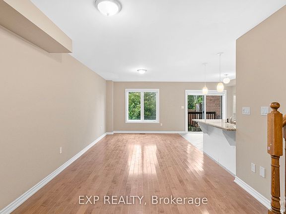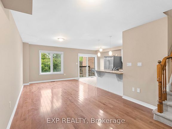 Welcome to a bright and spacious 3-bedroom, 3-bathroom townhome nestled in a quiet and peaceful neighbourhood. Backing onto the Harmony Valley Conservation Area, this home offers the rare luxury of lush treetop views and direct access to nature trails, all from the comfort of your backyard. The open-concept main level is flooded with natural light thanks to oversized windows and a smart, family-friendly layout. The kitchen is updated with stainless steel appliances, generous counter space and a charming eat-in area that walks out to a raised deck, perfect for morning coffee with a view. The primary suite is your personal retreat, featuring a walk-in closet and a private 4-piece ensuite. The finished lower level offers even more space with a walkout to the backyard, ideal for entertaining or creating a cozy rec room. Enjoy low-maintenance living with POTL fees that cover water, snow removal, garbage, and lawn care for common areas ($189.98/month). Located minutes from the 401 & 407, top-rated schools, shopping, parks and restaurants, this is your chance to live surrounded by nature without leaving the city. Don't miss this rare ravine-side gem, your peaceful Pinecrest lifestyle awaits!