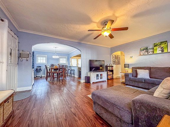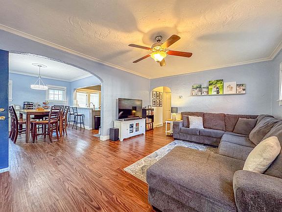 Large family roomFenced yardArched doorwaysCrown moldingHardwood floorsNew furnaceOpen concept