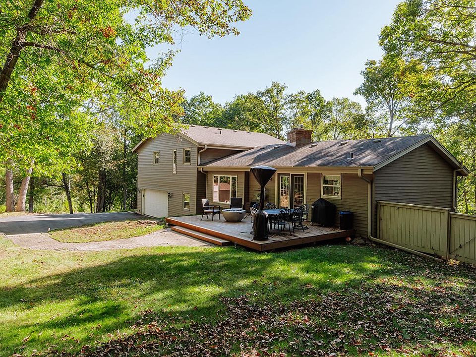 Nestled among towering trees & directly across from the scenic Glacial Drumlin Trail, this stunning 3BR 3 BA multi-level home offers breathtaking views and contemporary elegance. Its distinctive layout is designed for effortless entertaining,w/ 2 inviting living areas flowing seamlessly into a raised kitchen & dining space, all centered around a striking two-sided gas fireplace. Updated kitchen boasts granite CT, new 5-burner gas stove, oversized pantry, HWF, & custom built-in wine rack--perfect for culinary enthusiasts. Upstairs, the primary suite is a serene escape, featuring a private walkout deck & spa-inspired en suite bathroom. Two spacious guest bedrooms and a beautifully updated full bath complete upper level. Downstairs, enjoy the convenience of zero