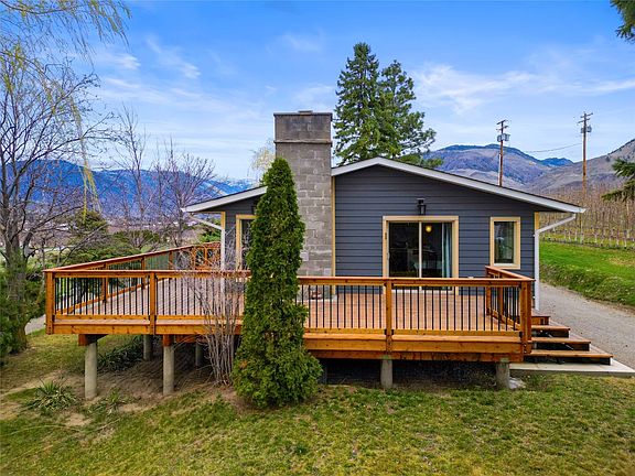 Seeking a unique property with a mortgage helper on 5.7 serene acres? This fully renovated home boasts R14 energy-efficient insulation and R8 Roxul on the exterior, providing optimal comfort and low energy costs. High-speed fiber optic internet and a ductless heat pump make this property ideal for modern living in a natural setting. With 2 wells on-site, the property also includes a 0.36-acre development area with no zoning restrictions. The home features two distinct suites: an upper-level, open-concept suite with 2 bedrooms, 2 bathrooms, and a kitchen that opens onto a spacious cedar wrap-around deck; and a lower suite with 1 bedroom, 1 bathroom, kitchen, storage, and a separate entrance, perfect for Airbnb or rental income. Additional highlights include a commercial space, single-car garage, 600 sq ft outbuilding, 1 acre of grapes, and 2 acres with irrigation. Conveniently close to schools, groceries, bakeries, a butcher, and health services. No foreign buyer restrictions. Measurements approximate; see listing remarks for details.