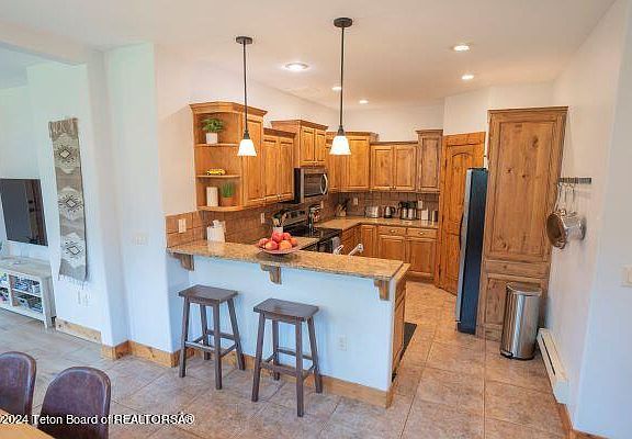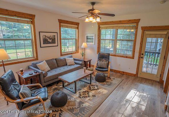 Enjoy a clear, unobstructed, and protected view of the Tetons from this beautifully decorated, turn-key 3-bedroom, 2-bathroom condominium. Experience the perfect blend of luxury and convenience in this ground-floor unit, perfectly positioned on the East end to showcase the breathtaking scenery from both indoor and outdoor living spaces. Nestled in a serene area surrounded by green spaces, this property stands out as one of the highest-rated and best income-producing short-term rentals in the area. Boasting an excellent review history, high occupancy rate, and numerous repeat customers, this condo is a prime investment opportunity. Its rental history surpasses others due to its superior location, quality furnishings, and stunning Teton view. Meticulously renovated, maintained and elegantly furnished with high quality décor and art, this condo offers a blend of comfort and sophistication. The open floor plan, generously sized bedrooms and two outdoor decks provide ample space for relaxation and entertaining. High-end finishes, modern appliances, and tasteful decor elevate this home above the rest. Whether you're looking for a serene retreat or a high-performing rental property, this condominium offers the best of both worlds.