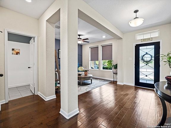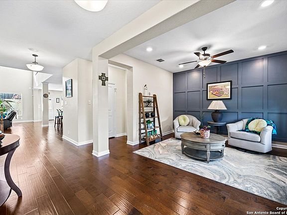 Welcome to this former David Weekley model home, designed with thoughtful details and modern comfort. Located just steps from the community pool, splash pad, playground, clubhouse, and sports court, it feels like having your own recreational center right across the street. Inside, rich wood floors flow through the main living areas, creating a warm and inviting feel. The dedicated dining room features a professionally designed custom accent wall, adding style and personality. The family room impresses with soaring ceilings and expansive windows that fill the space with natural light. The kitchen is bright and functional, featuring a gas cooking range, upgraded cabinetry, and a stylish backsplash. It opens seamlessly to the family room and breakfast area, keeping everyone connected whether cooking, dining, or relaxing. Thoughtful touches such as upgraded light fixtures enhance the home's character. The primary suite, conveniently located on the main level, offers privacy and ease. Its bath includes a large stand-alone shower and a well-planned layout. The laundry room is equipped with cabinetry and a folding area, making everyday tasks simpler. Upstairs, you'll find the rest of the guest bedrooms (one of them being a true junior suite featuring its own in suite full bathroom), and bathrooms along with a spacious flex room - ideal as a game room, media room, or even a fifth bedroom to suit your needs. Step outside to a generous covered patio, perfect for enjoying quiet evenings or entertaining friends. The backyard offers multiple levels and no neighbors behind, adding to the sense of space and privacy. A true three-car garage provides ample room for vehicles, storage, or hobbies. Unlike any other, the garage is climate controlled and it boasts epoxy floors for easy maintenance. The home's location also offers a short commute to major highways, keeping you connected while enjoying a community-centered lifestyle. This property blends comfort, convenience, and thoughtful upgrades-ready to welcome you home.