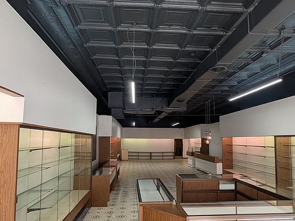 Light fixtures, display cases and all the shelving you need included in lease. Full basement with shelving for additional storage space as needed. Space is perfect for a variety of retail businesses.