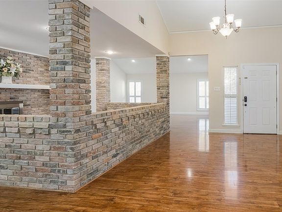 Brick fireplace nook areaLots of lightOpen floor planFenced rear yardFormal living and diningBuilt-in bookshelvesGranite countertops