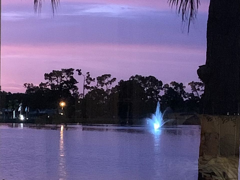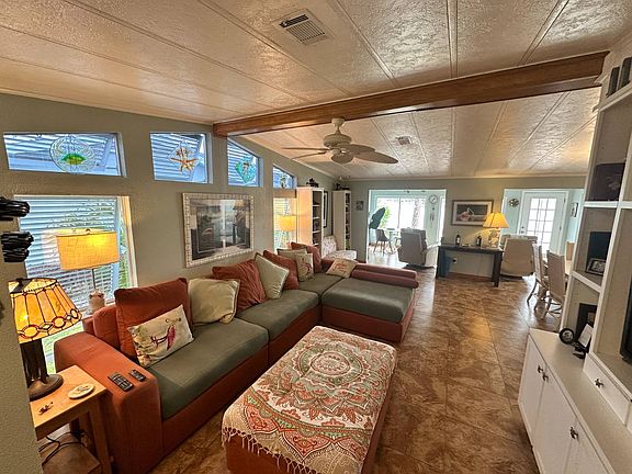LOCATION, LOCATION, LOCATION!! A beautiful and well cared for 2-bedroom, 2-bathroom home with gorgeous water and golf course view is being sold unfurnished. As you approach the home, you see the large garage with golf cart garage, tasteful landscaping and a covered entry. As you enter the home, you are greeted by the beautiful tile floors which are throughout the home. The foyer has a coat closet. The primary living area is open with a built-in wall cabinet with shelving. There is a lot of natural lighting due to the many windows. The dining room is open with a beautiful hanging light. The kitchen provides lots of cabinets and counterspace. The guest bedroom is a good size with a ceiling fan and closet. The guest bathroom has a tub with shower. The hallway has a closet with sliding corkboard doors. The primary bedroom is large with a wall-length closet. The primary bathroom has an updated vanity with glass tile backsplash, a linen cabinet, and a doorless walk-in tile shower with seat. The enclosed porch has large picture windows which provide beautiful views of the water and golf course. The deck is good size and has Trex decking. Off the deck is a large ceramic tile patio. The oversized garage can accommodate 1 car and 2 golf carts. It has lots of storage along with the washer & dryer, and hot water heater. UPDATES: Siding (2024), A/C (2018 with new warranty compressor in 2024), Vapor Barrier (2023), Roof (2022), Hurricane Bahama shutters (2023), 4-Point Inspection (2023), Moisture Insulation (2023) Only a few minutes to one of the five pools & hot tubs, clubhouse, & fitness center as well as tennis courts, pickleball courts and golf course. This community has a full social calendar and activity schedule. Plenty to keep you busy! This is a 55+ (very active) community. Come join the luxury lifestyle this community offers!!