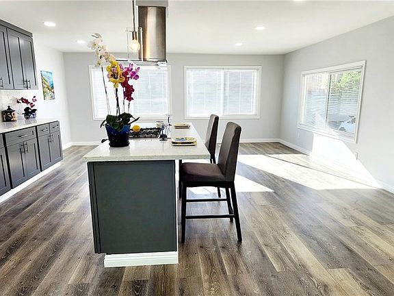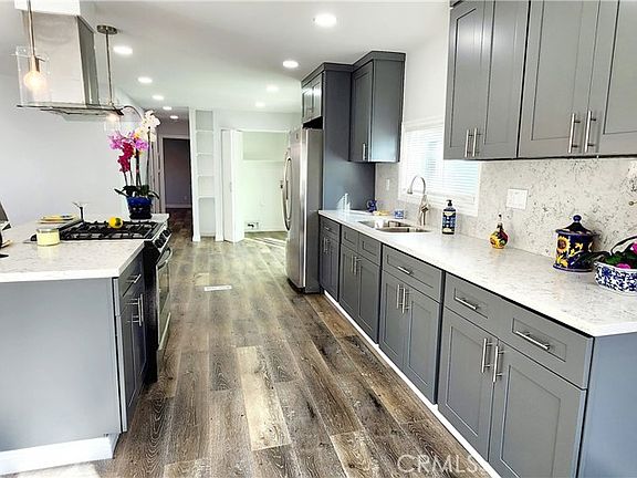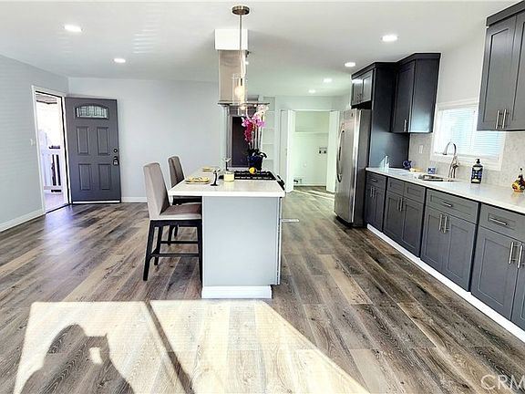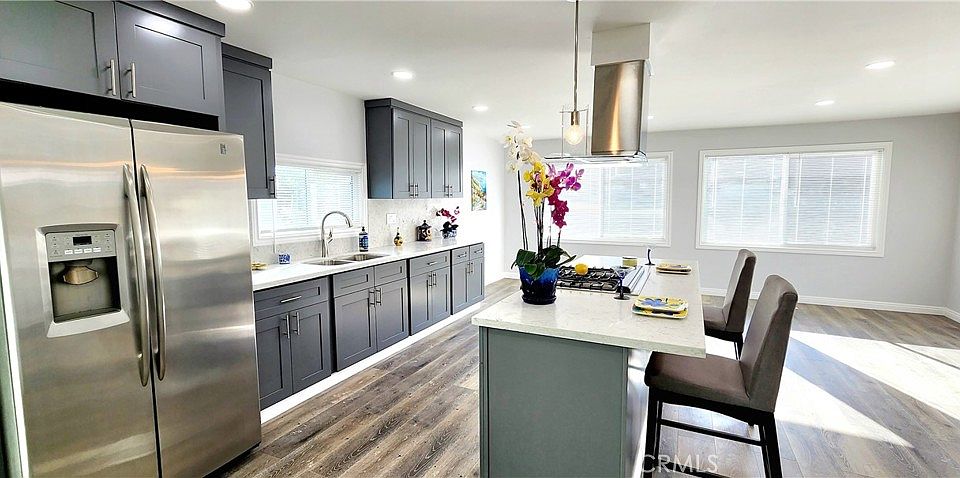 Presenting a new listing in Rainbow Mobile Park, is very rare for a home to come on the market in this park. It is a family park with low space rent of $950. Pool & clubhouse. Beautifully remodeled home inside and out. A stunning remodeled kitchen with an island and Quartz countertops. The open floor plan is great for entertaining. Stainless steel refrigerator, stove, and hood included. New wood grey cabinets with self-closing drawers. Recess light. Grey wood-looking laminate flooring throughout the home. Laundry room with gas hookups. Extra shelves in the hallway and both bathrooms. Both bedrooms have new grey wood-looking vinyl flooring, drywall, recess lighting, light fixtures, blinds, mirror closet doors, and bedroom doors. Remodeled bathrooms with newer shower, sink, cabinets, mirror, lighting, door, toilets, and flooring. New drywall and ceiling and paint. The outside has new paint and wood siding out. New dual pane windows and sliding glass doors for better energy efficiency. New wood patio on both sides of the home with vinyl flooring and wood steps. 3 parking spots in front of the home side by side. Conveniently located next to the 110, 405, 91, 47, bus, hospital and many food places close by.