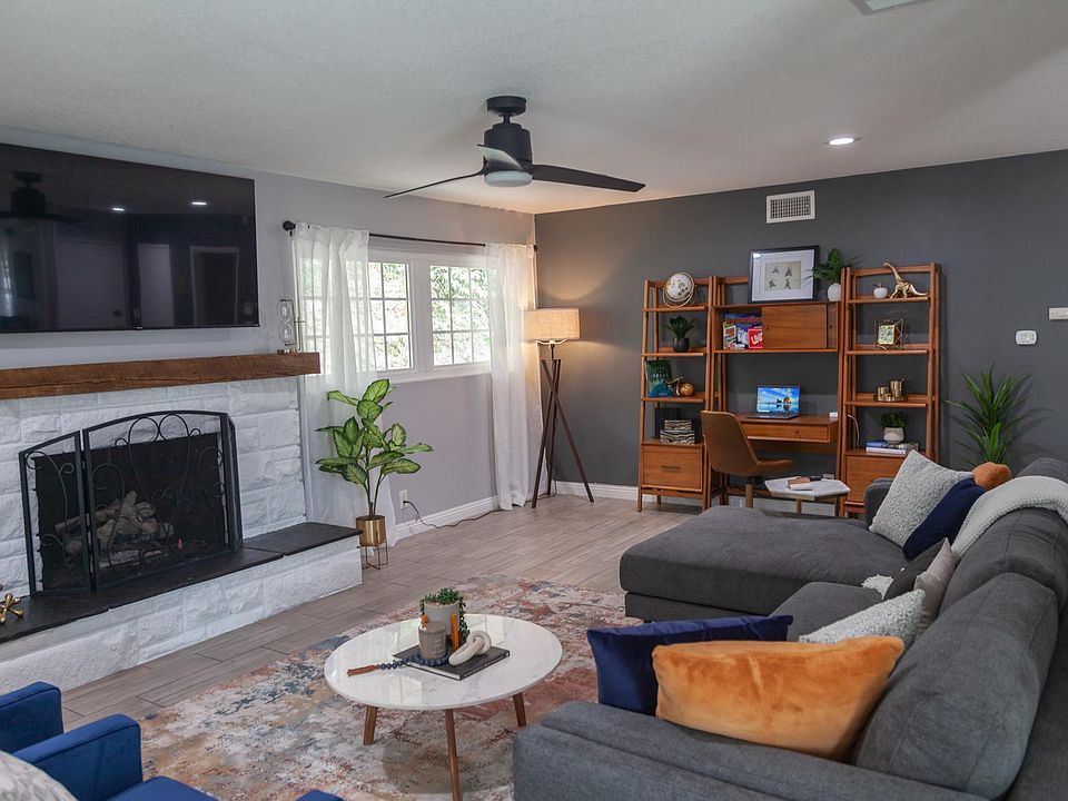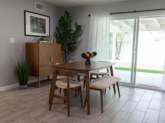 This Mid-Century Modern style cozy cottage has been fully remodeled and furnished for extended stay renters. It has an open concept from kitchen to dining room and living room with great natural light coming from the backyard. The backyard has a large new built patio cover and artificial grass, BBQ and patio dining table.