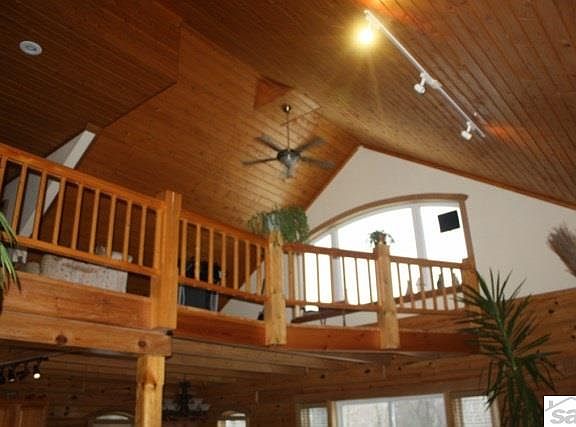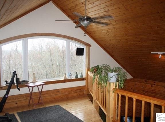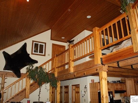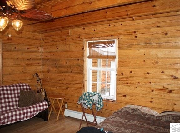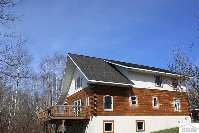 Stuck away on a private setting just off of the black top road is this 3+ bedroom log home with wrap around deck. Main floor has living room with wood fireplace, kitchen with dining area and sliding doors to the deck, two bedrooms and a 3/4 bath. Upstairs is the open loft area, master bedroom with master bath that includes separate tub and shower. There is a full basement that has a family room, den that is used as a bedroom, kitchenette area, laundry room, half bath and furnace room. Basement floor has infloor heat. Detached 2+ car garage is heated and has attic storage. Nice private setting with extra parking area. Lots of room for a garden, yard games and more. Right on the recreational trail, too!