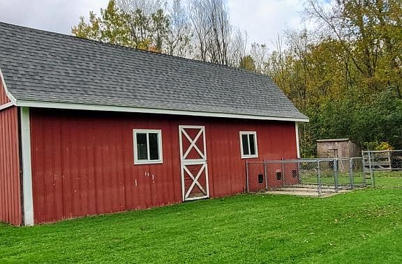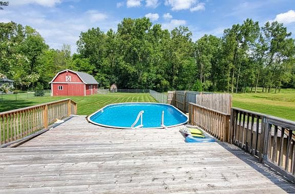 Dream of owning a hobby farm? Hunting on your own acreage? Floating in your on-ground pool & catching rays on a big sunny deck? With its big red barn (w/electric), hayloft, 3 kennel yards & 2 small coops (w/electric) & red maples, you could be the next Old McDonald here! Sitting on almost 4 acres w lush lawn, fenced yard AND plenty of woods to hunt & enjoy nature beyond the yard! Inside this quad features a big country kitchen w/hickory cabinets (pullouts!) buffet &island, Original hardwood floors & formal dining room on main floor. Family room focal point is a stunning fieldstone fireplace w oak mantle & flexible floorplan that could accommodate home office w/lav or 4th bedroom! Upper level incl 3 bedrooms + full bath w/ceramic floors. Recent updates incl new well '20, pool pump '21.Roof, Exterior vinyl & stonework '07, Family room & fireplace stonework '13, Vinyl windows & Barn roof '16. 2.5 car garage, long drive & extra paved space for boat/trailer. Ready? Get your Country on!