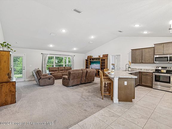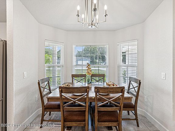 Rolling hills and almost quarter acre lots in this community of Springhill.. Built in 2022 with an open floor plan, split bedroom plan and sliver of conservation creating a no rear neighbor view. Your extra long driveway provides extra parking. Enter your covered front porch with a sitting area into a ceramic tiled Foyer. The vaulted ceilings and triple living room window provide an abundance of openness and natural light. The kitchen and dining room with its bay window on 20'' ceramic tile, rich browns and neutral palette give you the canvas for any decorating. To your left is the Primary Bedroom, garage entrance and laundry room with shelving and an alcove that would make for great storage shelving. The primary bedroom has a private bathroom with garden tub, walk -in shower, dual sinks and a walk-in closet. The right side of the home are your other two bedrooms separated by the guest bathroom. Your large kitchen with breakfast bar is open to the living space with views of your covered back patio. So much exposure to family and guests. Matching stainless steel frigidaire appliances. Your garage floor has been painted and sealed. Home has a recirculating septic system and public water. Just off County Line Rd with quick access to US 19. Just minutes from Weeki Wachee Preserve, Buccaneer Bay, home of the mermaids and Weeki Wachee Springs State Park. Schedule your showing today.